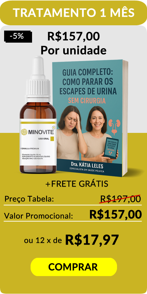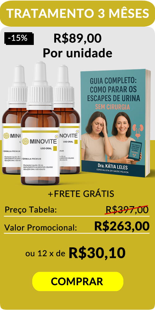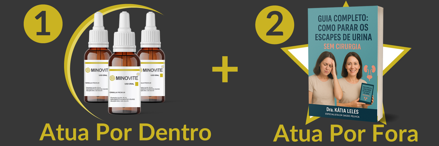 É COMPOSTO DE DUAS FRENTES: 1 - Nutracêutico em Gotas MINOVITE 2 - Livro GUIA COMPLETO: COMO PARAR OS ESCAPES DE URINA - SEM CIRURGIA